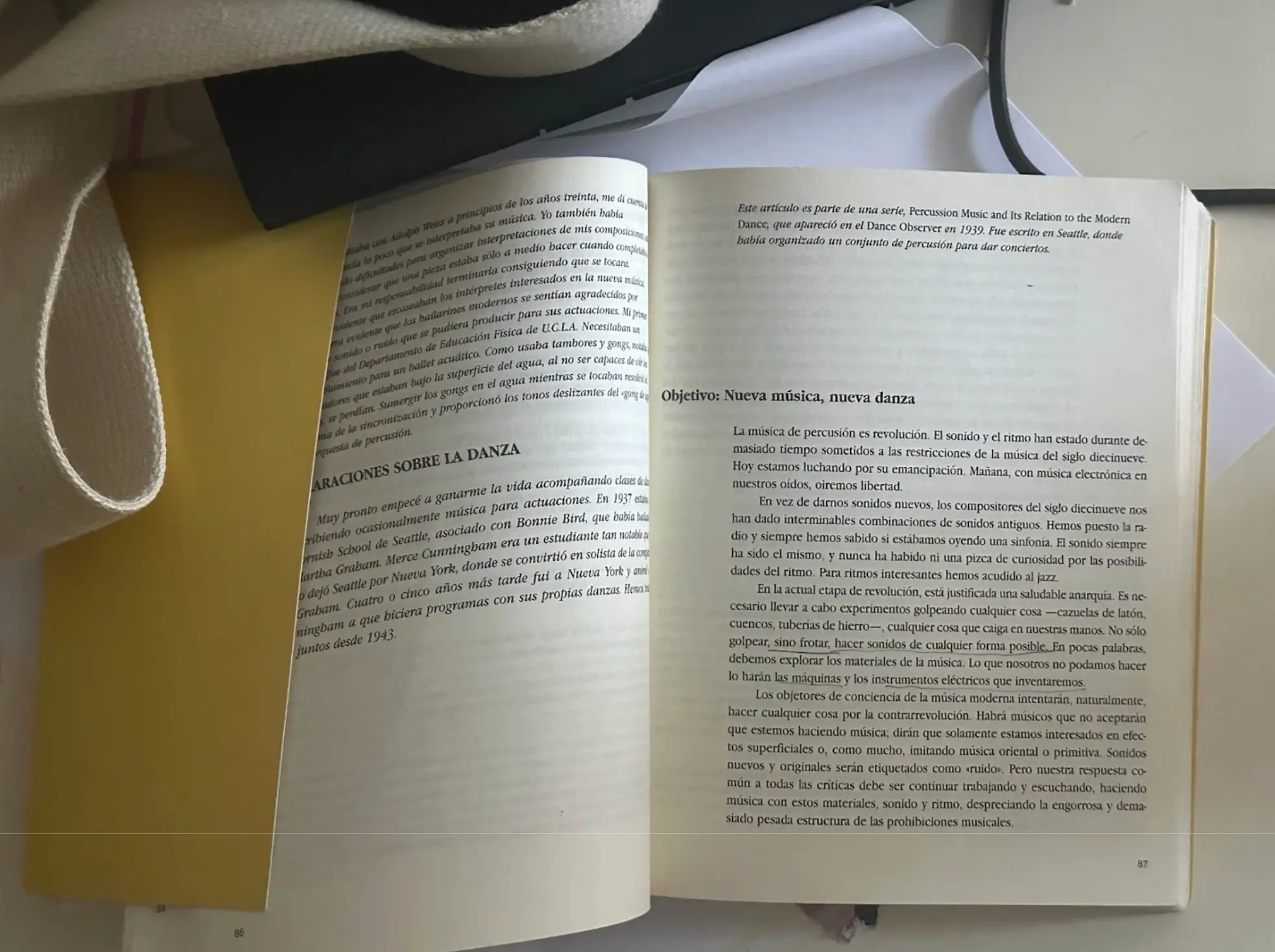 Without going too deep into how the book changed hands, there was a part that really stayed with me, an excerpt from a series called “Percussion Music and Its Relation to the Modern Dance” published in Dance Observer in 1939. In it, he writes about percussion and its future, predicting the arrival of electronic instruments and machines that would do what we can’t. That struck me. I was fascinated.