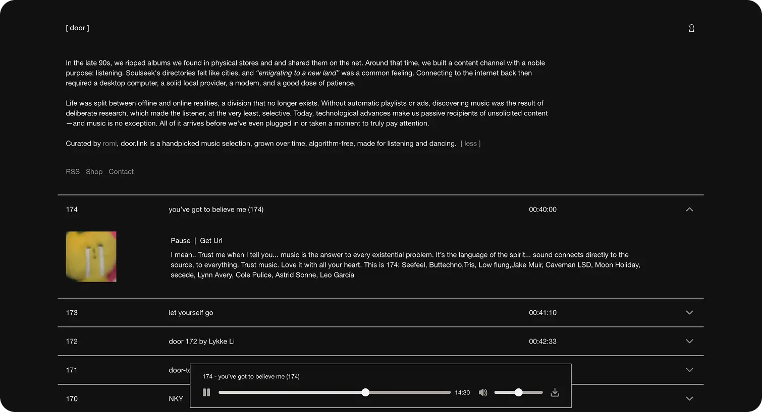 As Romi’s design practice grew, visions of a sacred listening space became more HTML tangible. Her early inklings eventually gave rise to the ongoing sanity project door.link. She uses the public webpage to host mixes handpicked by herself and her loved ones, from husband Javi to Lykke Li. It's a devotional internet node. There’s no ads or algorithms or marketing funnels to crawl out of. Instead, the minimal-tech zone strives for a new internet by invoking the old one. An interface that does less. Not for the sake of user optimization, but to let the magic run unencumbered.