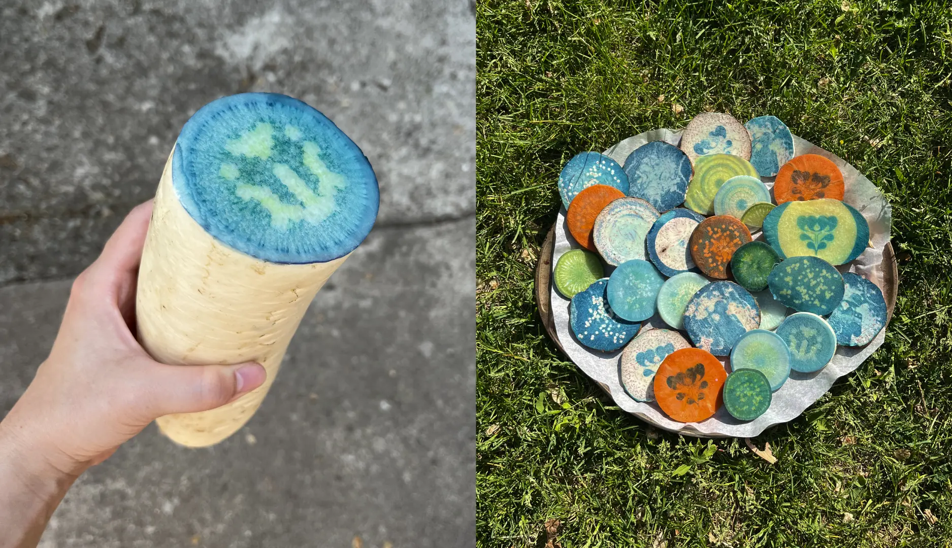 Emi: One experiment that hasn’t made it into a project (yet) was when I was deep into sun printing. I tried printing on a series of root vegetables and fruit: carrot, radish, jicama, taro, apple... There’s something exciting about working with such unpredictable materials. The results were ephemeral, really fun, and strange. I’d like to keep exploring image-making with organic resources around me, discovering new processes that reveal or inform a visual language or pattern inherent to the materials.