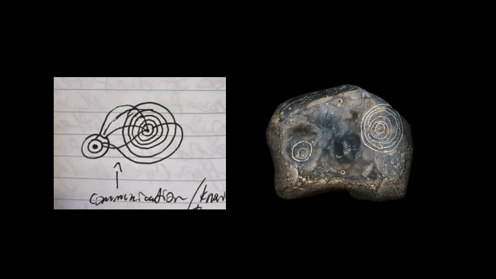 Nik: Earlier this year, I was researching petroglyphs — these ancient human mark-making techniques on stone. It was prep for the Dodeda project, which uses the surface of a rock I found as an animation space. I was reading about one petroglyph on Wikipedia that looked like a bull’s eye, named cup-and-ring marks, which no one’s definitively deciphered the meaning of. Then I listened to a lecture about archaeology on YouTube, talking about where these marks had been found. The guy mentions this archaeology book cataloguing every known instance of these bull’s eye petroglyphs in the UK, as well as every known theory about their possible meaning. He’d rate them 1 to 10. [Laughs] The Prehistoric Rock Art of Galloway & The Isle of Man by Ronald W. B Morris. His diagrams had a big impact on Dodeda.