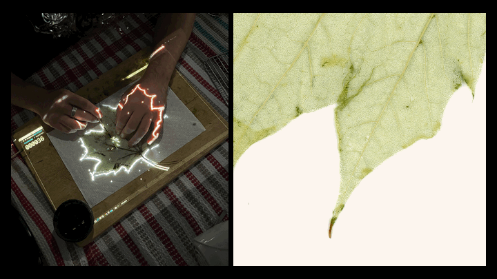 Emi: Like a collaged plant picture frame. I had only worked with grape leaves before. We did the Ghost Orchard animation in October, so there wasn’t much green left. I wasn’t sure it was going to work. But the glue we used to keep the leaves together led to unexpected transformations in the printing process.