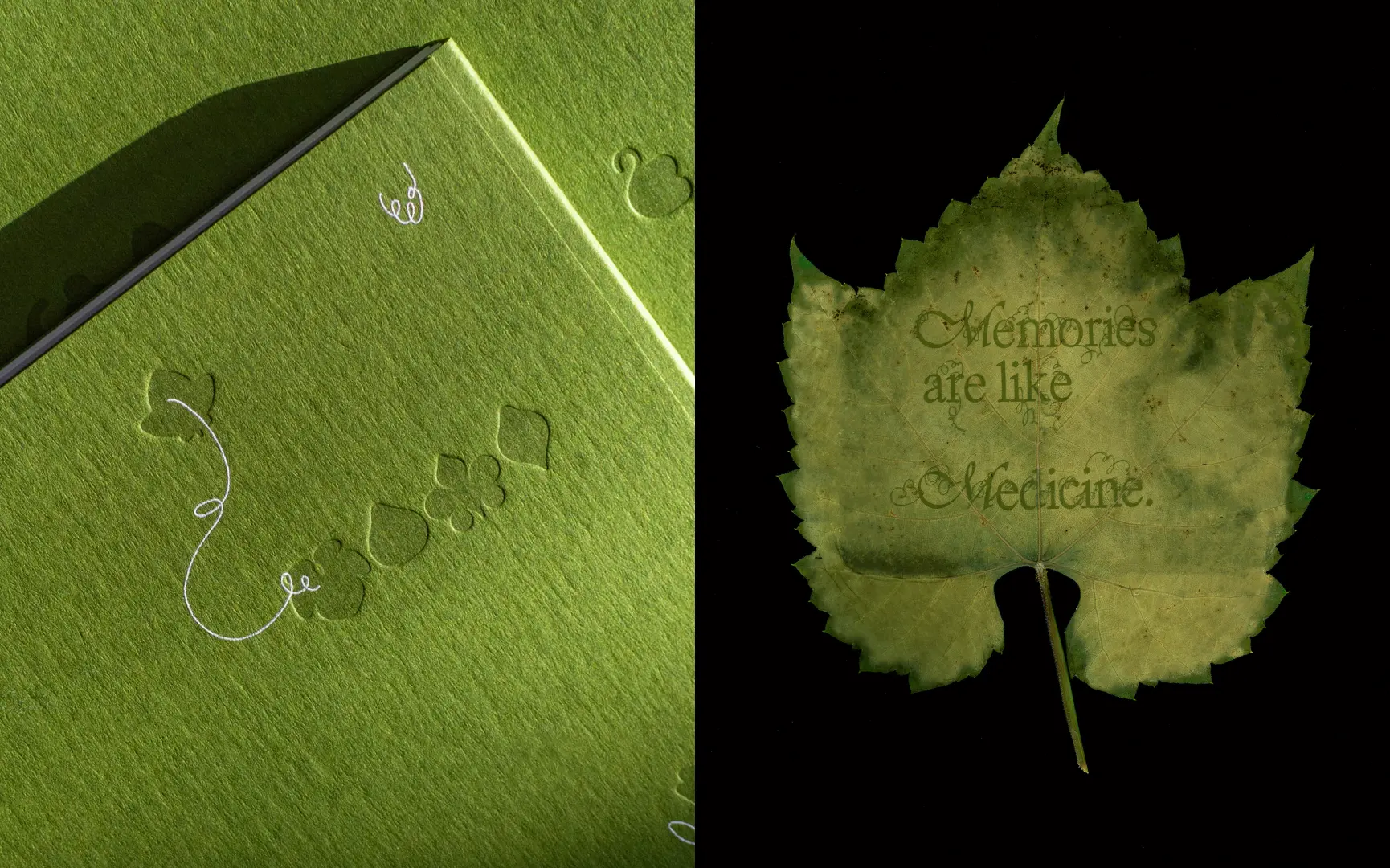 Emi: We still found ways to make this sprawling passion project quite structured. We had presented a deck to the author, Anna, at the beginning. [Laughs] Some habits stick with you. We were able to embed all of these references to her story within the physical material, these different metaphors. Anna had such a close relationship with the subject and knew what references to expand on. The process of folding, rolling, and wrapping rice in grape leaves inspired the book’s packaging. The green cover and extended inner flap wrap around the white pages, holding the story, as an homage to the dish. We also created custom glyphs inspired by the growth cycle of the grapevine plant, debossed on the covers and arranged like a secret botanical language, echoing the dialogue inside. Picking the right shade of green was a big deal, around #798C3A. We touched a lot of paper.