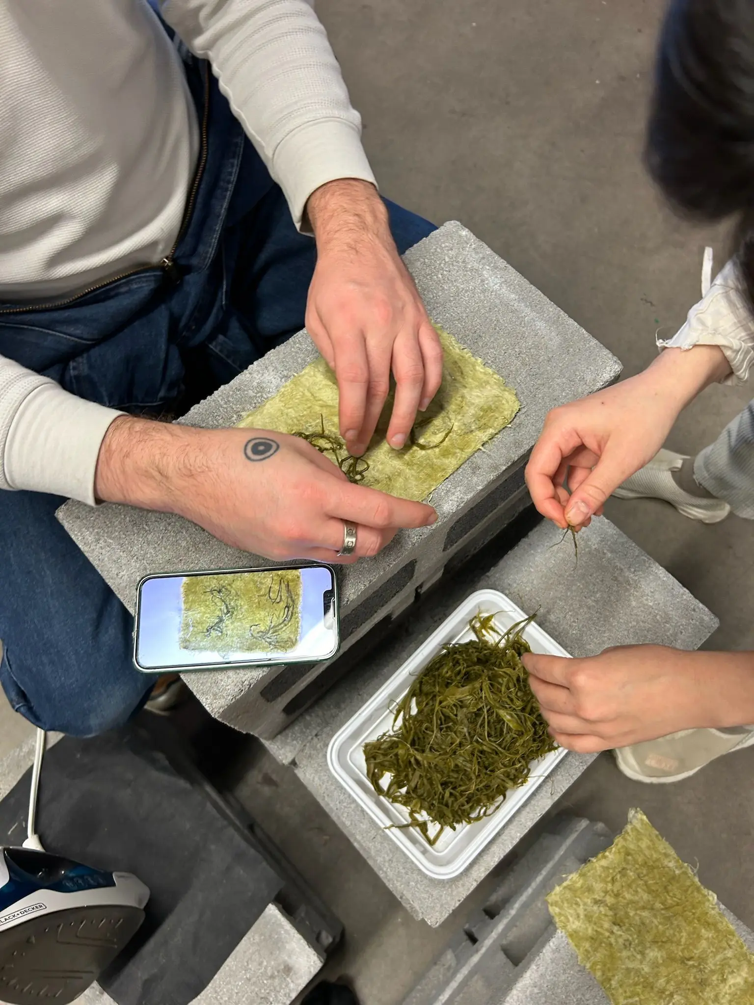 Emi: Our three projects together have all been chlorophyll-coded, if we can call that a tool. We only make green work. [Laughs] Tweezers are a vital tool for us. Cotton swabs, tooth brushes. Working with different leaves and strands requires such precise movements.