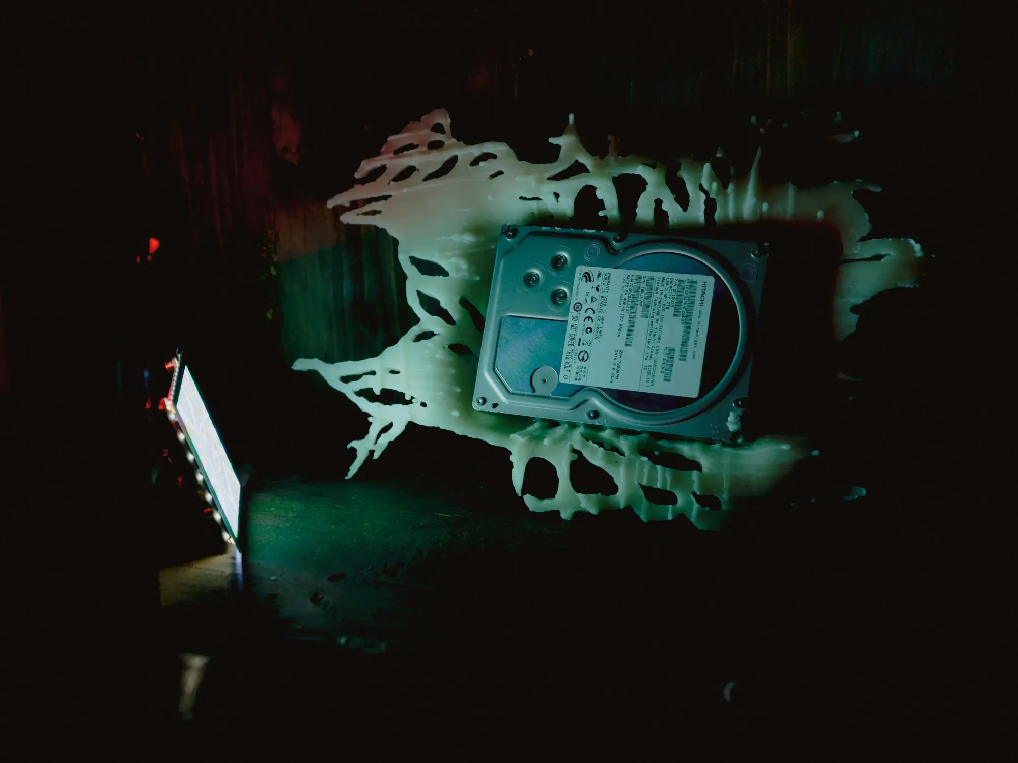 Ben: I think that’s fair. The organs. Processing everything. That fossil, that sculpture, is made out of resin. Like amber. We were imagining someone finding this drive in 200 years, uncovering it, seeing its files, excavated and analyzed. I wanted to expose everything as much as I could. That’s why there’s a deconstructed computer in the back, all the cables running to the speakers, 2D becoming 3D becoming the subject of a laser scan… we built a software for it.