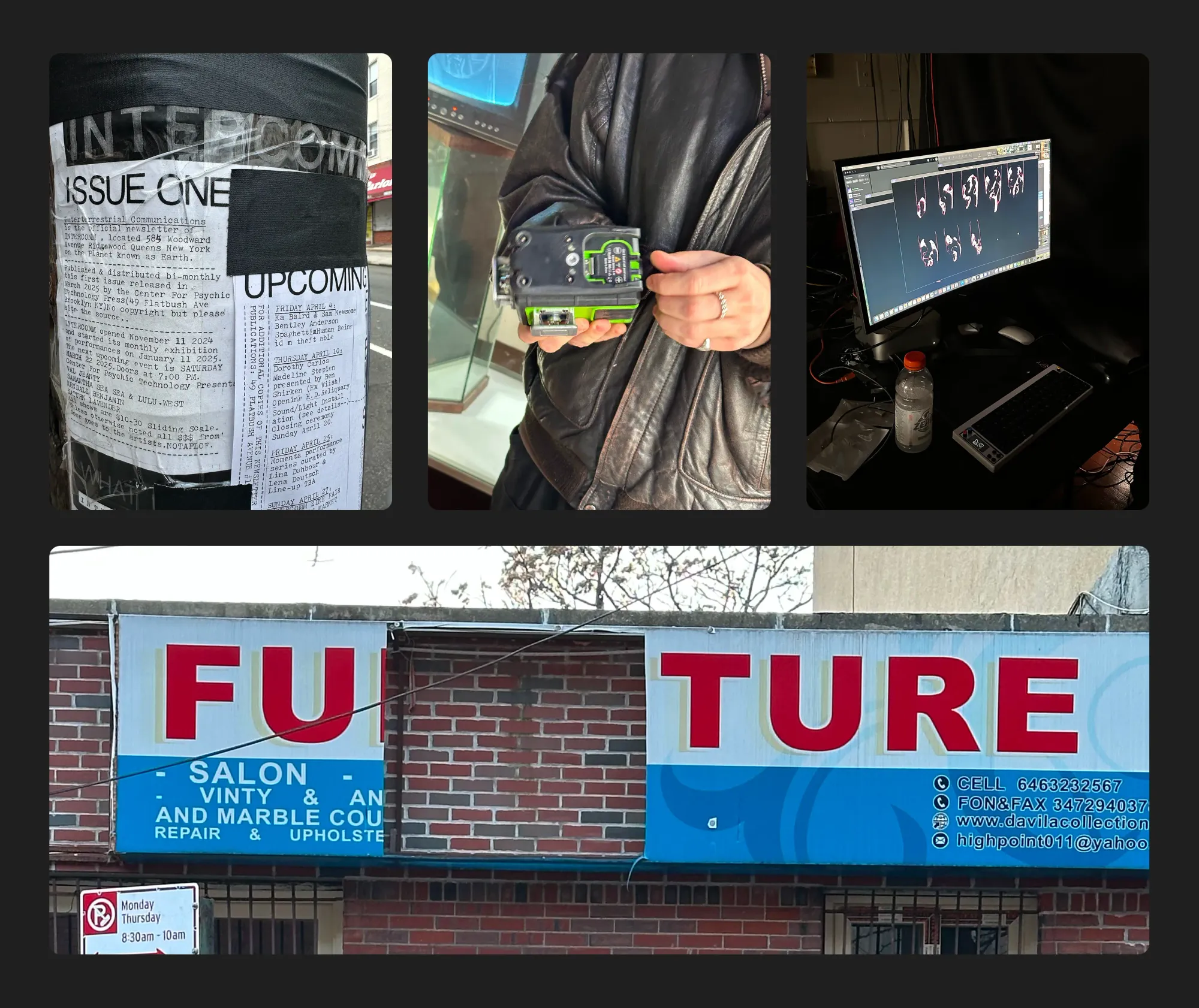 My first time crossing the metal threshold at FURNITURE, aka a new Ridgewood haven called INTERCOMM, reveals, in its current form, a makeshift house of worship. Priest-free, undogmatic, illuminated by a chorus of animations and machines. As if 50,000 files escaped their containers and painted the walls with new religion. Memory beamed 'til infinity, in tune with the infinite. Multichannel music, x-rayed earthmatter, laser scanners, fossilized hard drives, and two couches (which play the role of pews in the dark) offer a zone to sit, exist, and transform. This is the latest conjuring of 29 Speedway boss Ben Shirken (ex.wiish), whose album turned public séance, H.D. Reliquary, pumps the heart of this architecture — and offers a glimpse at visions of a new institution loading.