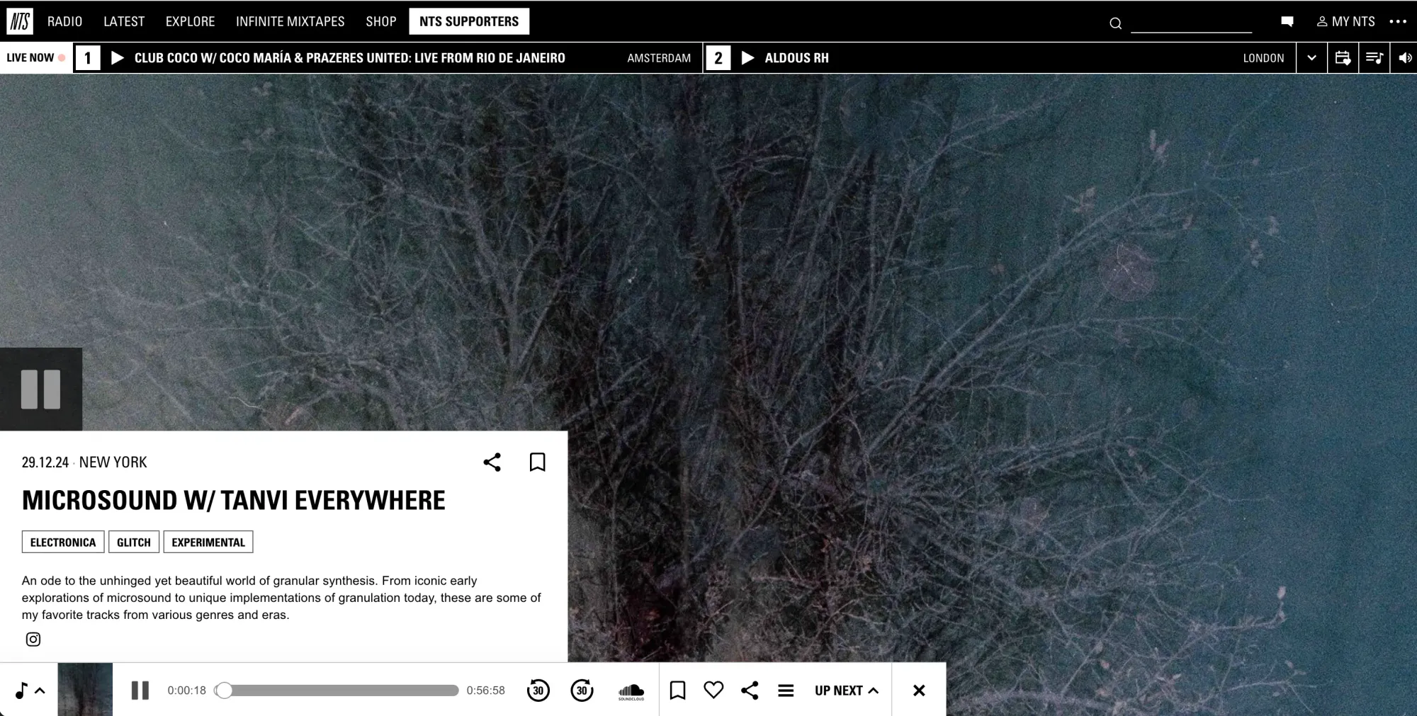NTS was a dream, even if it was just a supporter mix. We’re getting there. I rabbitholed through specialized granular synthesis forums, synthesizer research from universities, a book about synth music in India… I included one girl I know, JEWELSSEA, who makes amazing music. The show is called Microsound. On N…